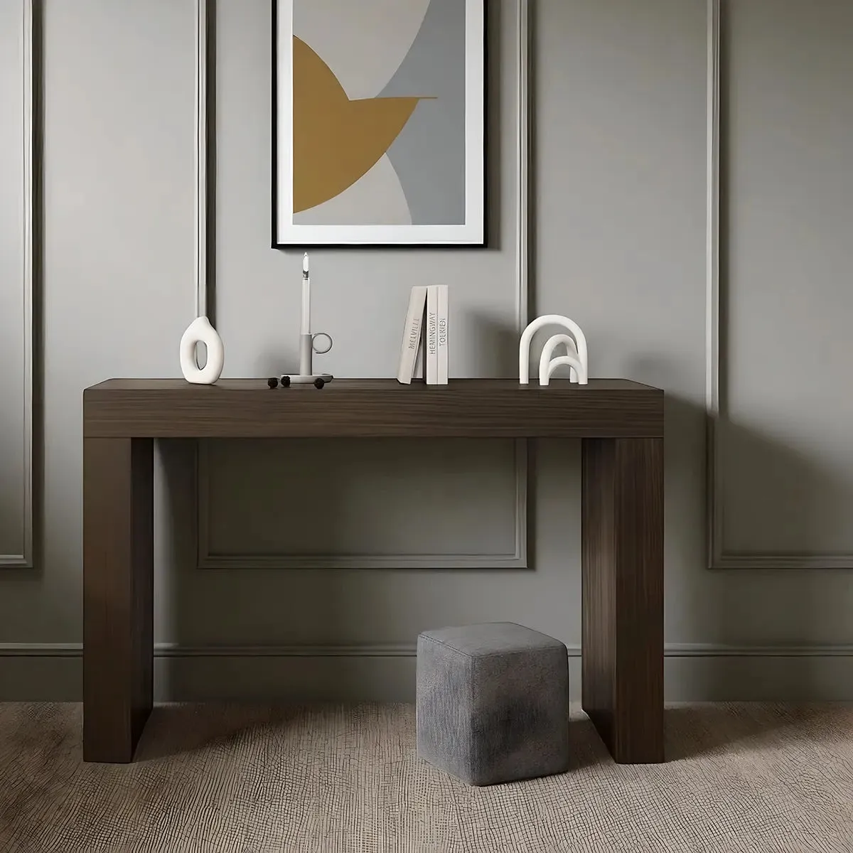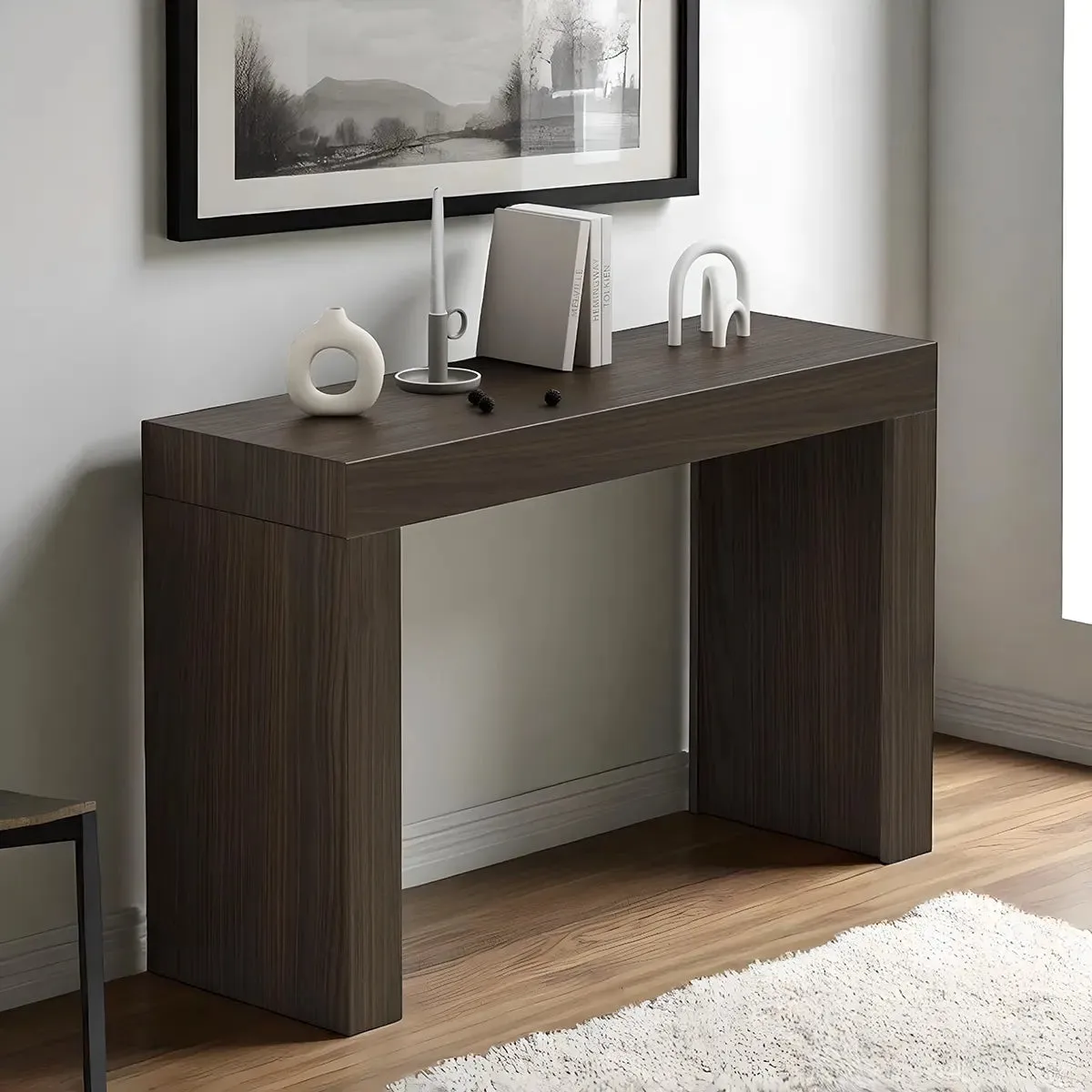 Walnut Console Table, Contemporary Minimal, Sleek Silhouette is designed for everyday living where function and style work together. The images show a clean profile with careful attention to grain and joinery. The piece presents a stable top for keys, books, art, and daily essentials. The overall look reads balanced and calm, suited to entryways, living rooms, hallways, or behind a sofa. The design keeps a modest footprint so it fits homes and apartments while still offering useful surface area.