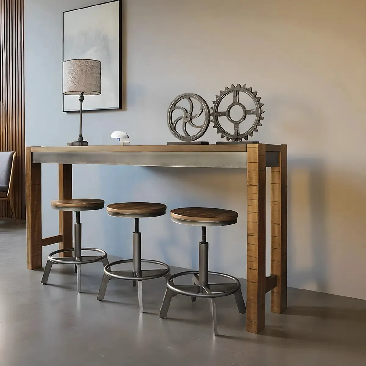 Reclaimed wood boards show knots, saw marks, and time earned patina that contribute to an industrial modern mood. The profile is slim and linear to hug the wall and leave clear walking paths. Corners and edges are neatly refined to pair with metal accents, neutral rugs, and simple wall art. The table sits comfortably under a mirror or artwork and creates a focused welcome point without visual clutter.